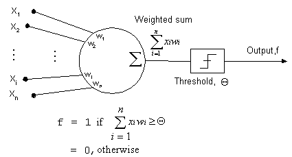 As can be seen from the diagram, a TLU has various inputs X1,X2,...,Xn. These inputs are multiplied with the corresponding weights and added together. If this sum is greater than the threshold value, the output is a high(1). Otherwise, the result is low(0).