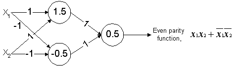 Although a single TLU is sufficient to implement simple boolean functions (functions that are monomials or disjunction of literals), not all functions can be implemented in this way. Examples are the XOR and the even parity function. For such functions, a network of TLUs is needed. Such a network of TLUs is called a Neural Network. A neural net implementation for the even parity function is given below: